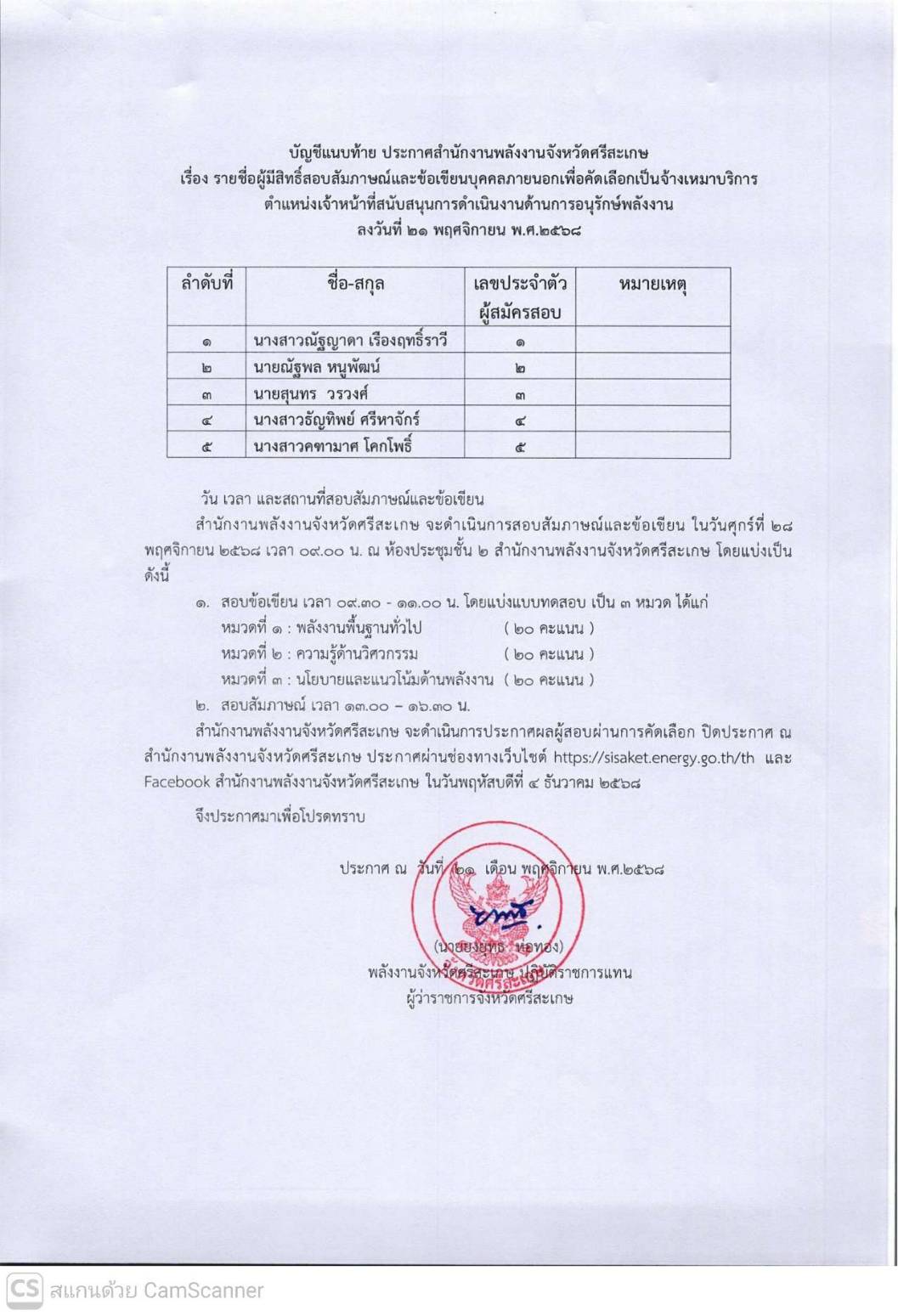 ประกาศสำนักงานพลังงานจังหวัดศรีสะเกษ เรื่อง รายชื่อผู้มีสิทธิ์สอบสัมภาษณ์บุคคลภายนอกเพื่อคัดเลือกเป็นจ้างเหมาบริการ